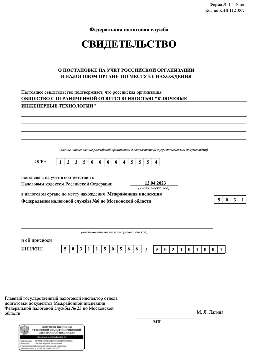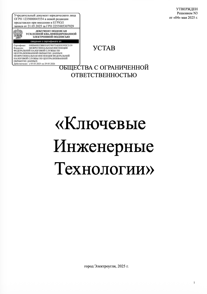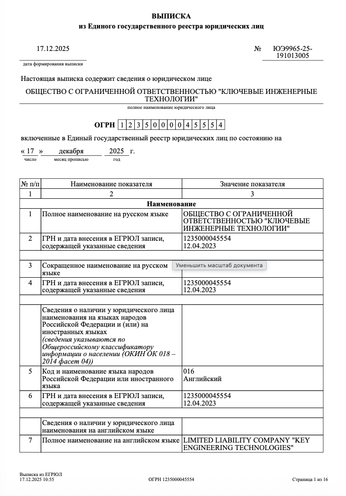 | Полное наименование организации | Общество с ограниченной ответственностью "Ключевые инженерные технологии” | |